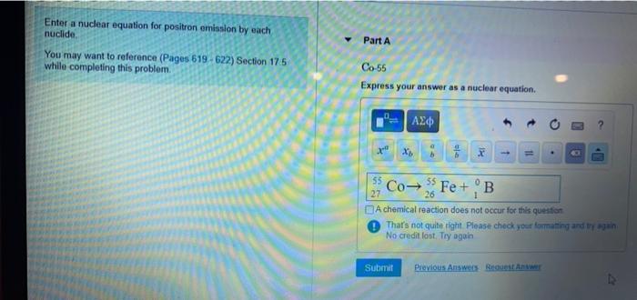 Co-55 Express your answer as a nuclear equation. Answers Correct The radioactive. You may want to reference Pages 619 - 622 Section 175 while completing this problem.